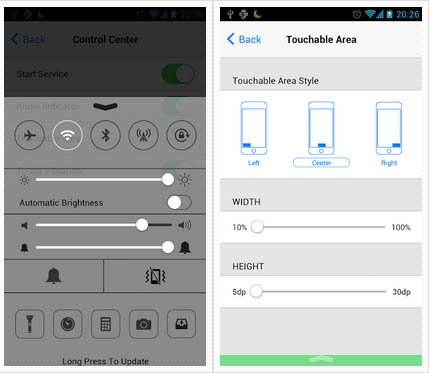 «Control Center – iOS 7 Style» вызывается свайпом снизу вверх на любом экране. После этого пользователь получает доступ к таким настройкам как «режим в самолете», Wi-Fi, Bluetooth, яркость экрана, громкость системы и приложений. Кроме того, есть возможность установить ярлыки для быстрого доступа к программам. Например, к фонарику или камере.